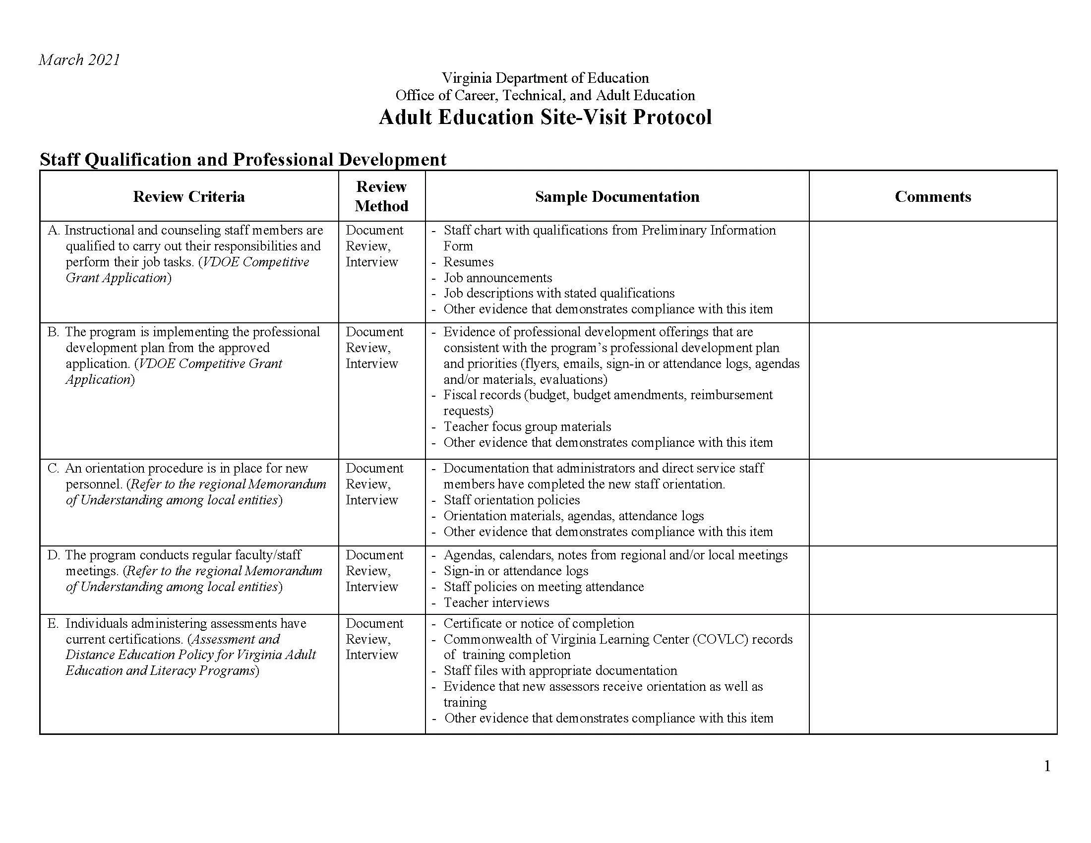 As the fiscal agent for Region 8, FCPS is responsible for ensuring subrecipients meet requirements that are in accordance with the grants received. Site visits are an essential part of this responsibility. Therefore, the site visit will entail a review of programmatic (including data sampling) and financial processes of ACPS' Adult Education programs. A breakdown of the specific items for review is listed in the documents below, for your reference.